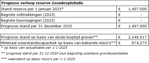 Zie in onderstaande tabel de prognose van de reserve Grondexploitatie op basis van de actualisaties van de grondexploitaties bij de jaarrekening 2024. De reserve Grondexploitatie blijft eind 2025 naar verwachting op € 1.50 miljoen en eind 2026 op € 1.77 miljoen. Wanneer de Reserve zich ontwikkelt conform de bij de herziening opgenomen prognoses ontstaat er naar verwachting financiële ruimte om een gedeelte van het eerder ontvangen bedrag van de Algemene Reserve dividenden en huuropbrengsten terug te storten. Het op termijn terugvloeien van het positieve saldo van de grondexploitaties is niet in de begroting opgenomen. Hierdoor lopen we geen risico als de prognoses tegenvallen en het positieve saldo van de grondexploitaties uiteindelijk lager uitvalt.
